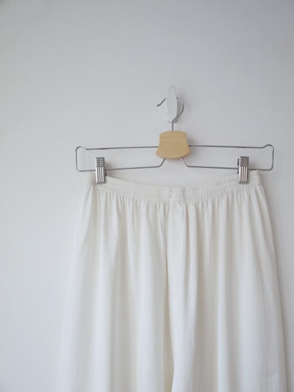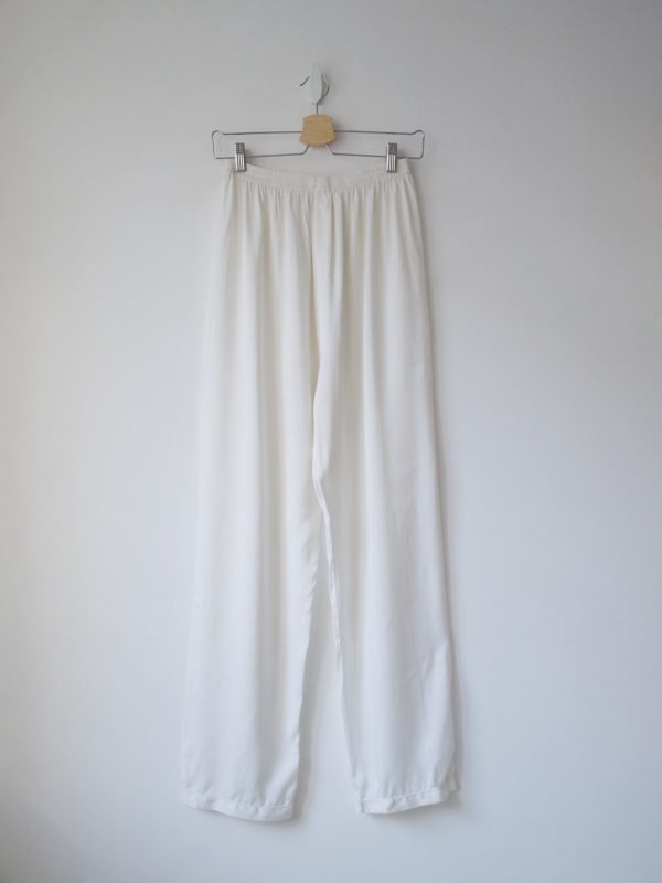 Jedwabne spodnie piżamowe. Luźny fason z bardo wysokim stanem oraz prostymi nogawkami, w pasie elastyczna gumka.