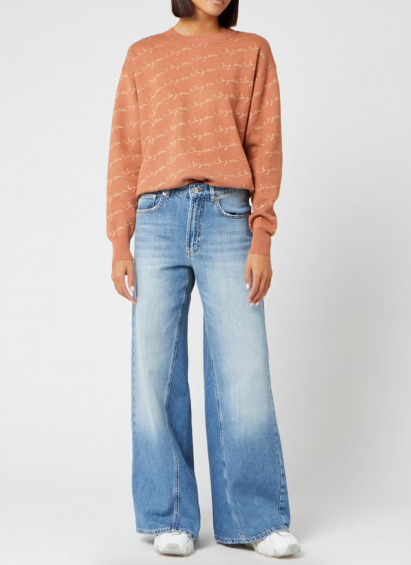 Sweter luksusowej marki Chloé, cena katalogowa £235.00, czyli 1200 zł. Lekko luźny fason, po całości zdobiony błyszczącym logo.