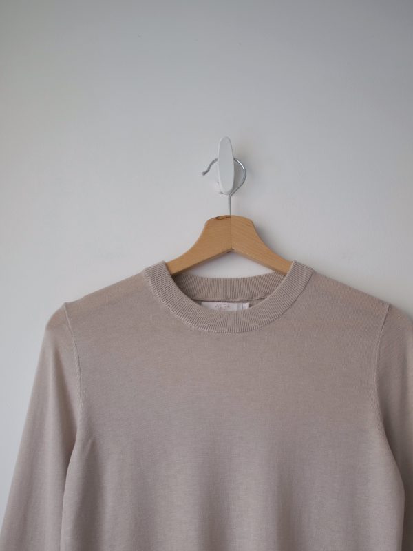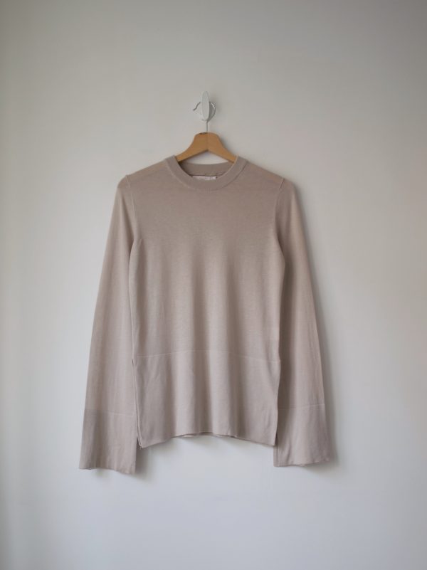 120,00 złCienki sweter skandynawskiej marki Wera Stockholm. Wykonany z miłej w dotyku mieszanki z dodatkiem jedwabiu oraz lnu. Kolor to jasny szaro-beżowy.