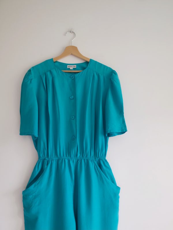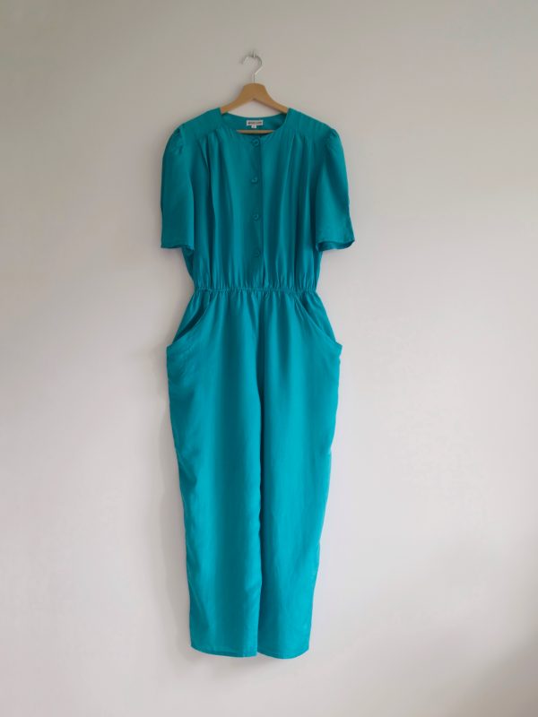 150,00 zł130,00 złJedwabny kombinezon vintage. W pasie posiada elastyczną gumkę. Na jednej nogawce milimetrowe wada, pokazana na zdjęciu, absolutnie nie jest widoczna inie przeszkadza w noszeniu.
