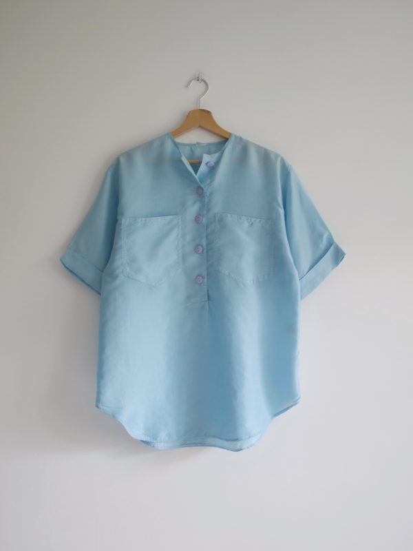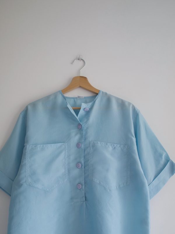 Rozmiar z metki: S, bardzo luźny Skład: 100% jedwab Stan: bardzo dobry Szerokość w klatce 54 cm Długość całkowita 75 cm