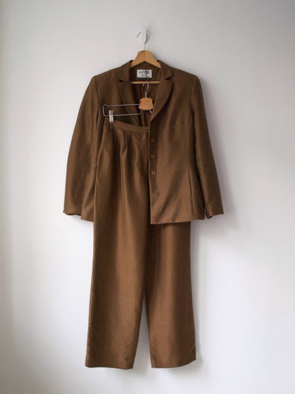 Unikatowy jedwabny garnitur. Wykonany z tajskiego jedwabiu o charakterystycznej strukturze i połysku. Marynarka o klasycznym fasonie, z kieszeniami i delikatnymi poduszkami w ramionach. Spodnie zwężane w pasie, z podszewką.