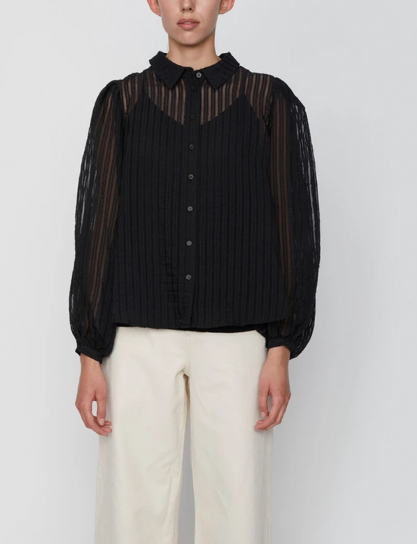 Półprzezroczysta koszula skandynawskiej marki Just Female. Model Soil Shirt, cena katalogowa: $171. Koszula z bufiastymi rękawami, wykonana z materiału w paski.
