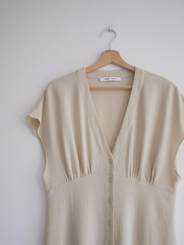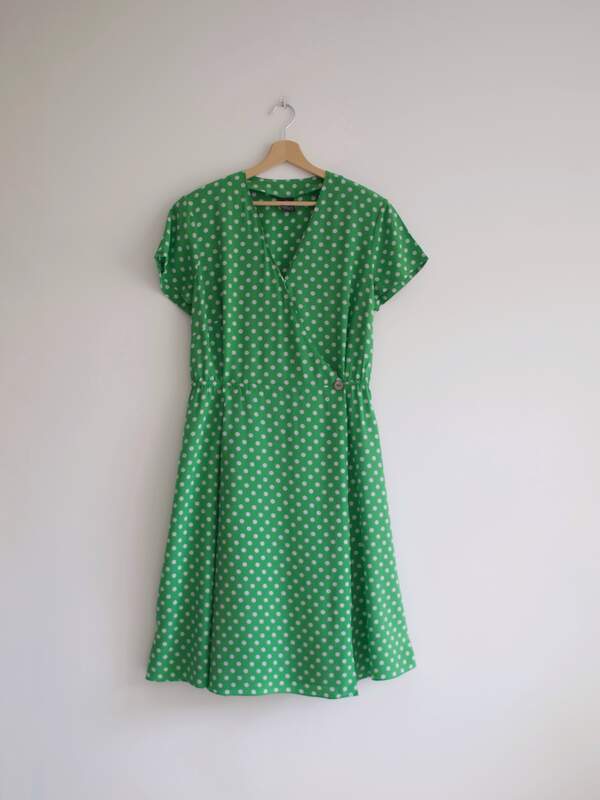 150,00 złJedwabna sukienka niemieckiej marki Madeleine. Kopertowy fason, gęsty materiał bez podszewki. W dwóch miejscach ma malutkie plamki, które gubią się we wzorze i nie są zauważalne w noszeniu. Są pokazane na ostatnich zdjęciach.