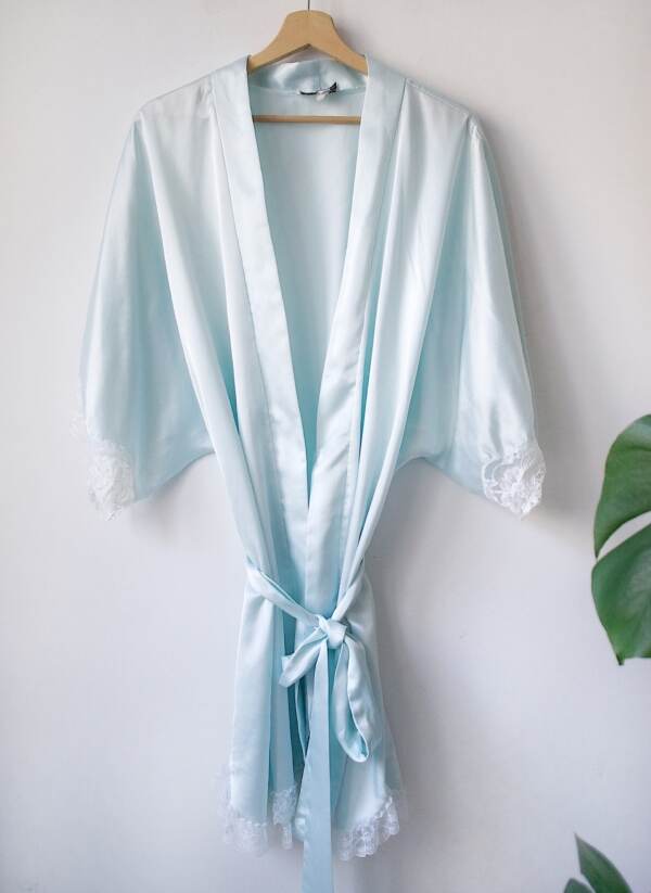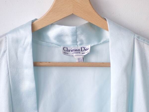 Satynowy szlafrok vintage domu mody Christian Dior. Wyprodukowany w Stanach Zjednoczonych, materiał to 100% poliester. Dół i rękawy wykończone koronką. Rozmiar z metki L, dość uniwersalny, długość całkowita 93 cm. Bardzo dobru stan.