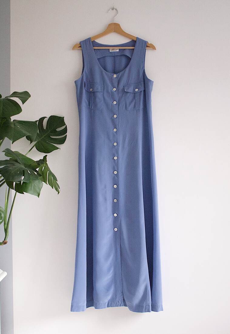110,00 złJedwabna sukienka vintage w pastelowym niebieskim kolorze. Zapinane na guziki z naturalnej muszli. Klasyczny model, poszerzany ku dołowi, z tyłu wiązanie w pasie. Na dole milimetrowa dziureczka, absolutnie nie widoczna i nie przeszkadzająca w noszeniu. Rozmiar z metki M.