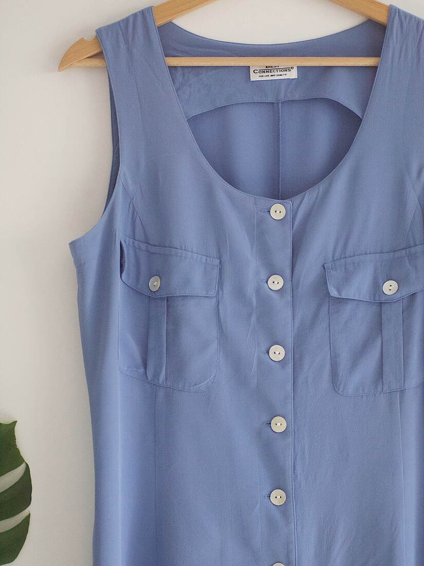 110,00 złJedwabna sukienka vintage w pastelowym niebieskim kolorze. Zapinane na guziki z naturalnej muszli. Klasyczny model, poszerzany ku dołowi, z tyłu wiązanie w pasie. Na dole milimetrowa dziureczka, absolutnie nie widoczna i nie przeszkadzająca w noszeniu. Rozmiar z metki M.