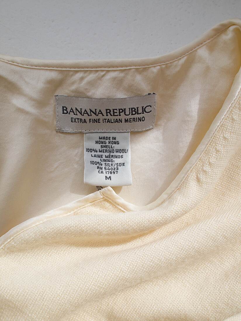 65,00 złKardigan marki Banana Republik wykonany z wełny merynosa, z jedwabną podszewką. Rozmiar z metki M (będzie dopasowany), polecam na XS-S. Kardigan ma zacerowaną dziureczkę na rękawie (na zdjęciach), poza tym bez wad.