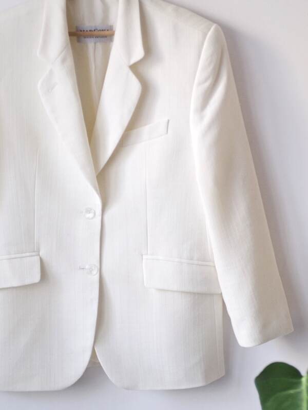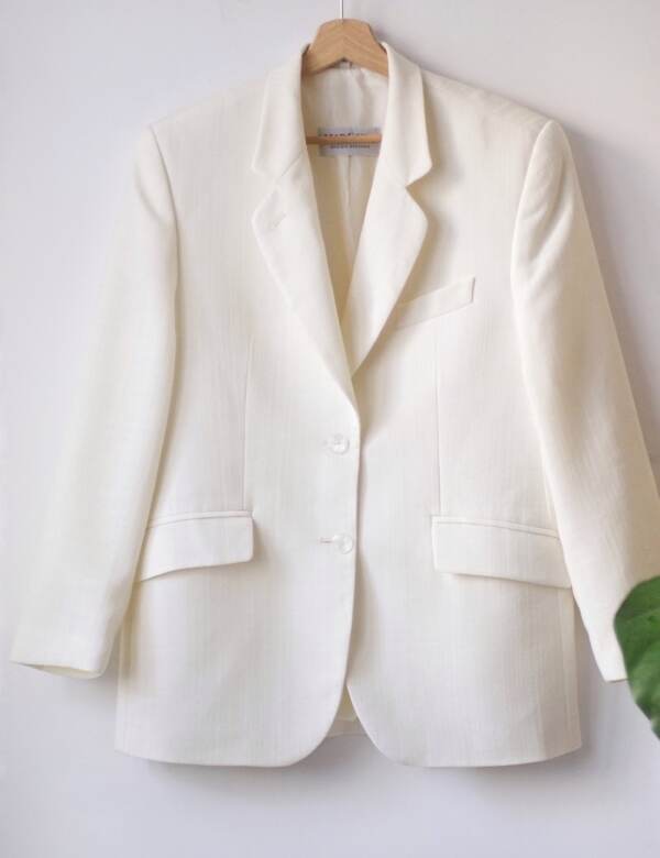 Marynarka w stanie idealnym. Wyprodukowana w RFN, materiał to mieszanka wełny (85%) i jedwabiu (15%). Ma szersze ramiona, będzie dobra na rozmiar M i na XS-S jako oversize. Modelka ma 175 cm wzrostu.